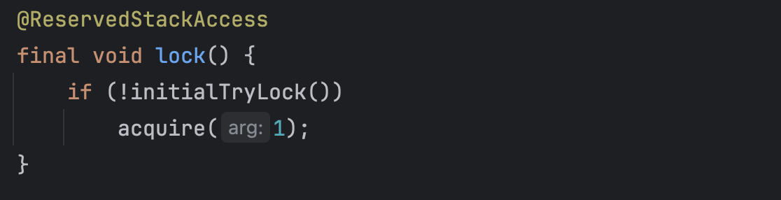 ReentrantLock.lock() 호출해 내부의 sync.lock()으로 진입한다. 진입 후 아래의 메서드를 탄다.